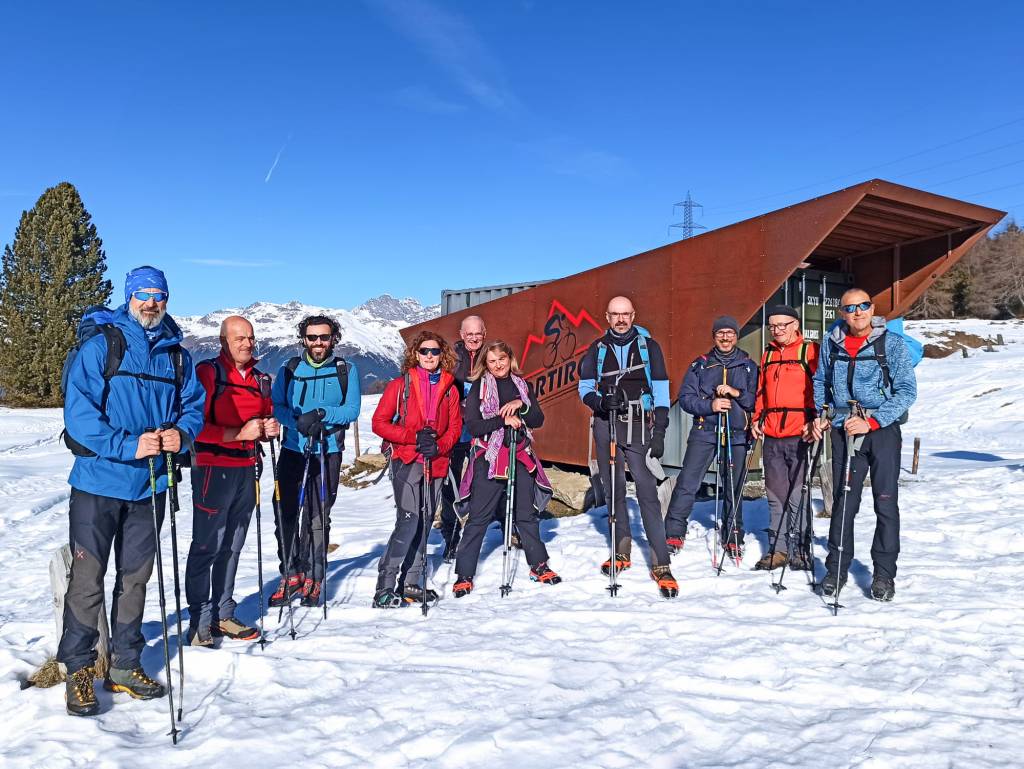 Lasciata l’auto, lungo la carreggiata fuori dall’abitato di Monno, 10 escursionisti del CAI di Rovato, si sono incamminati lungo la strada asfaltata che porta alle malghe e prosegue poi per il Mortirolo. La neve scarseggia, ma quella compattata lungo il sentiero obbliga a indossare i ramponcini se non si vuole scendere rovinosamente a valle.
