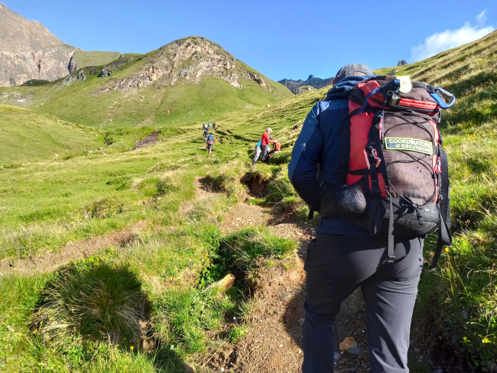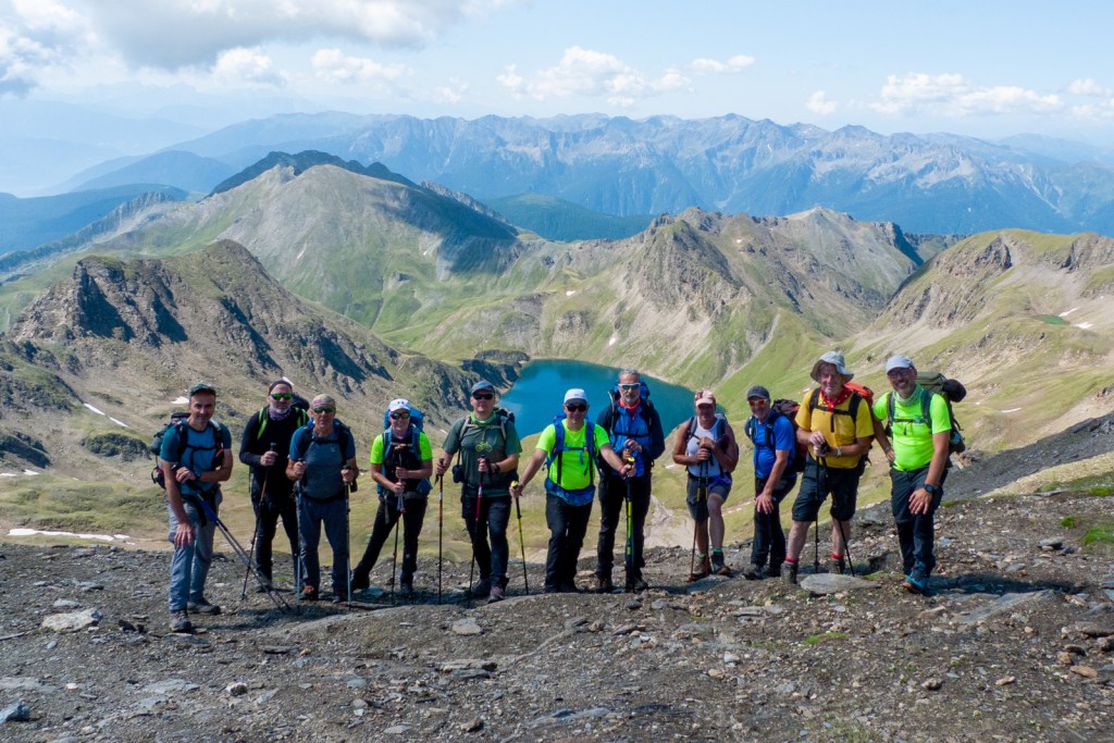 La domenica (9 luglio) è iniziata con la partenza alla volta del Picco della Croce. Salita interessante in un paesaggio d’alta quota, con terreno “sfasciumato” e parecchie lingue residue di neve, che hanno reso la progressione più divertente e caratteristica. È sempre bello arrivare in vetta ad un tremila, nel caso di oggi 3132 mt, stringersi la mano ed ammirare il panorama, sentendosi in armonia con sé stessi e con il creato, ed assaporando quella sensazione unica che solo l’alta montagna ti regala, e che ti permette di essere un tutt’uno anche con gli altri escursionisti.