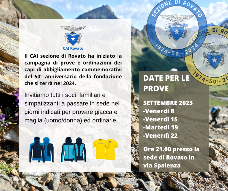 ll CAI sezione di Rovato ha iniziato la campagna di prove e ordinazioni dei capi di abbigliamento commemorativi del 50° anniversario della fondazione che si terrà nel 2024.