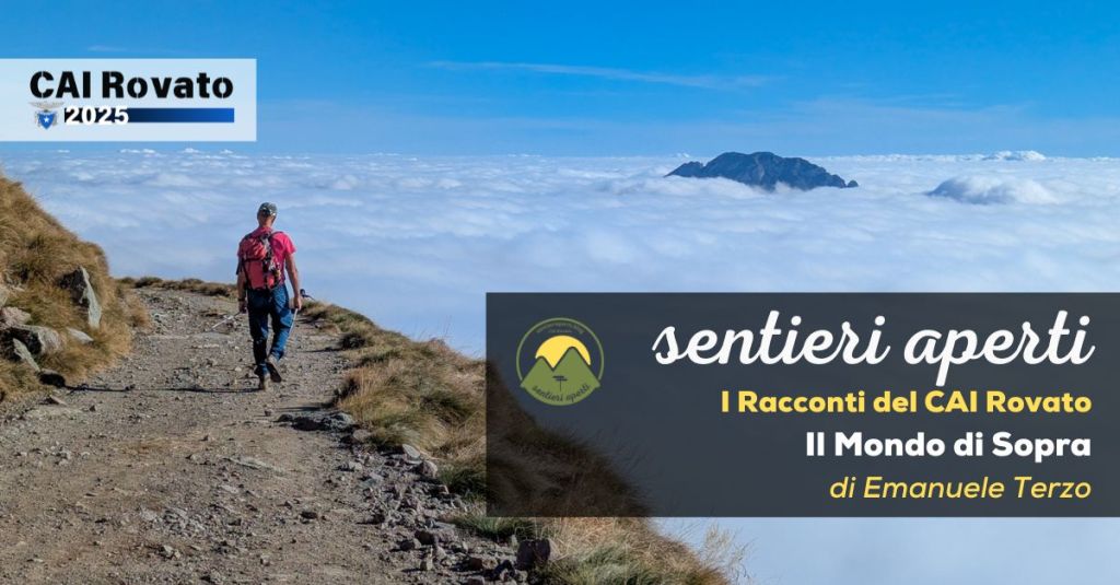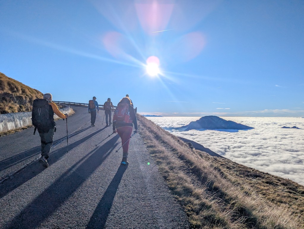 Superata quota 1900 metri, il miracolo: il cielo si è aperto, e sotto di noi si stendeva un mare di nuvole compatte, immobile, silenzioso. Solo le cime più alte sbucavano da quella distesa bianca, come isole in un arcipelago celeste.