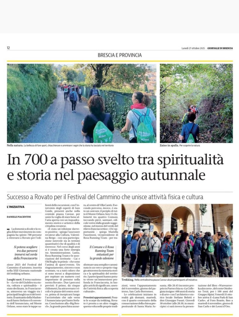 “Grazie a tutti per aver partecipato e a chi ha reso possibile questo straordinario evento: il Festival del Cammino d’Autunno e la ventiduesima Giornata Nazionale del Trekking Urbano, svoltisi domenica 26 ottobre 2025 a Rovato.