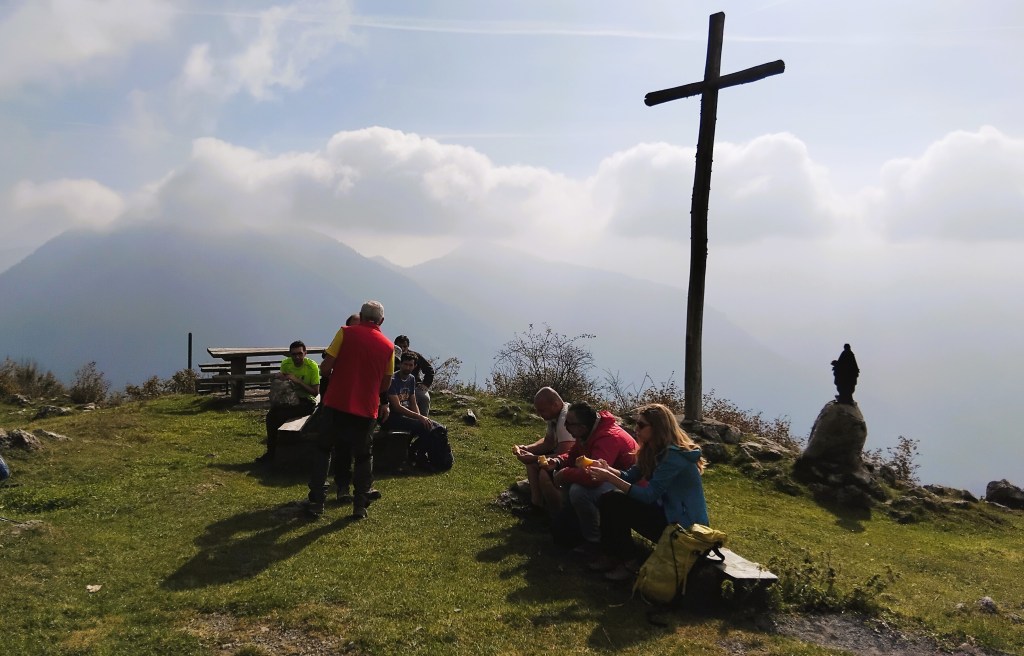 Arrivati a destinazione, abbiamo scattato fotografie tutti insieme, tentando di riprendere, per quanto possibile, anche il panorama alle nostre spalle, purtroppo una leggera foschia, più probabilmente delle nuvole basse ci impedivano di godere di una visuale che, nei giorni limpidi, doveva essere molto bella.