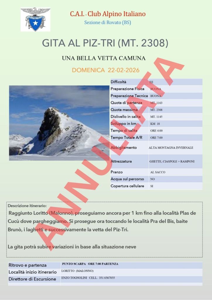 La gita è stata annullata per condizioni meteo e ambientali da valutare, e sono in corso ipotesi per altre alternative. Ultimo aggiornamento 14/02/2026