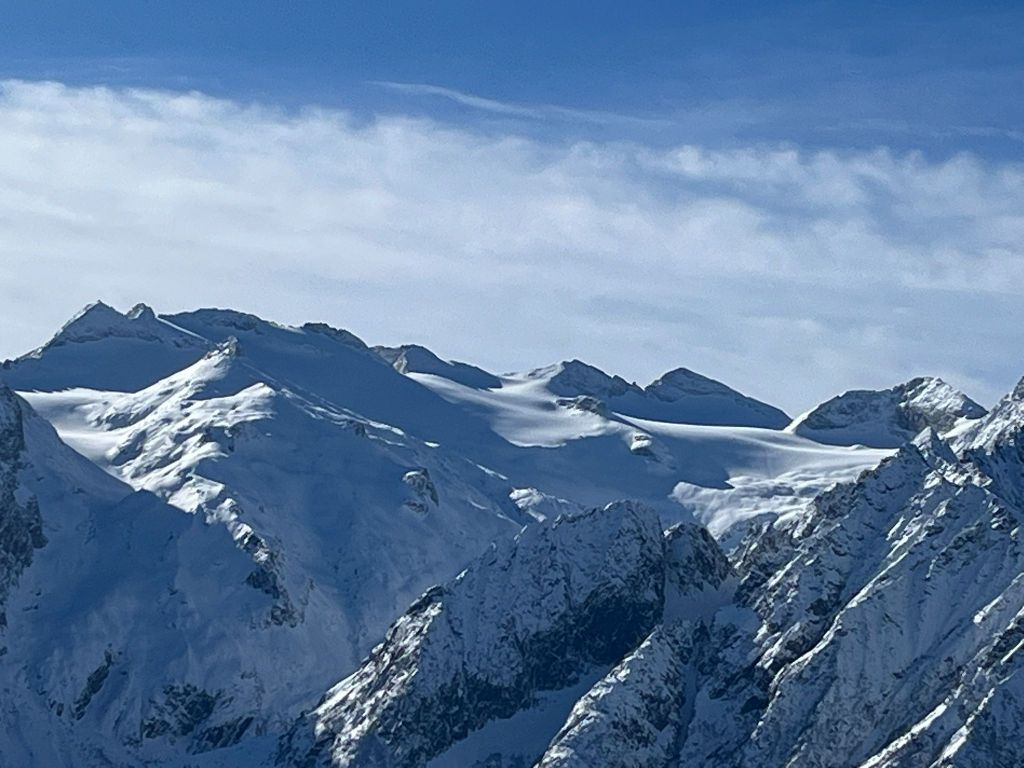 Resto lì, immobile, e mi sciolgo davanti a una bellezza che non chiede nulla: cime innevate, ghiacciai immacolati, silenzio.
