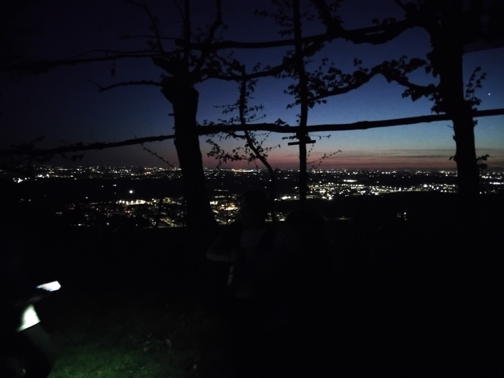 Una salita lenta, in cui assaporare il paesaggio, i suoni della natura e delle creature che popolano il Monte Orfano, con sullo sfondo il cielo, che da azzurro si è striato di rosso al tramonto, prima di lasciare spazio al buio della notte.