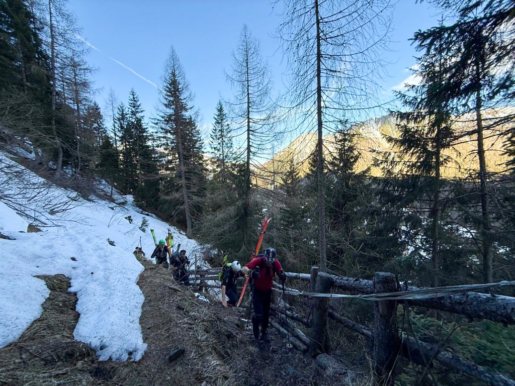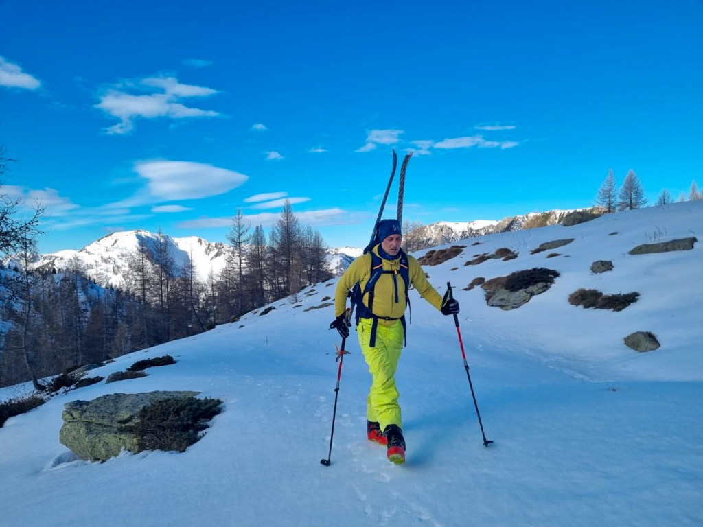 Le pelli dovranno attendere più di 500 mt di dislivello prima di esprimersi nella loro preziosa funzione. Ma il momento è sempre gratificante, specie se il teatro aperto si mostra ben innevato fino alla croce di vetta già visibile, quasi 700 mt sopra di noi.