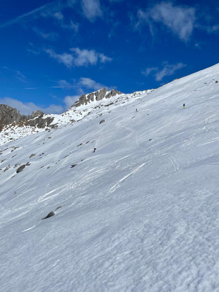 La discesa su neve portante consente le tipiche evoluzioni del carattere da ragazzini ripescate nel fondo dell’animo degli adulti e, diciamolo a bassa voce, anche degli anziani!