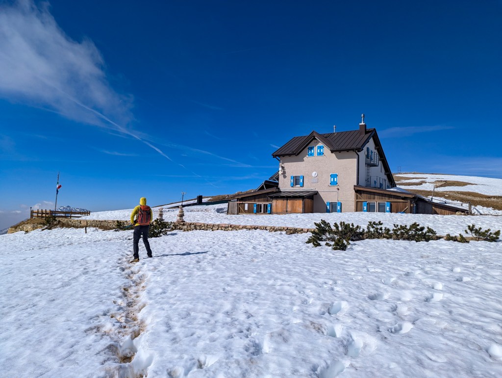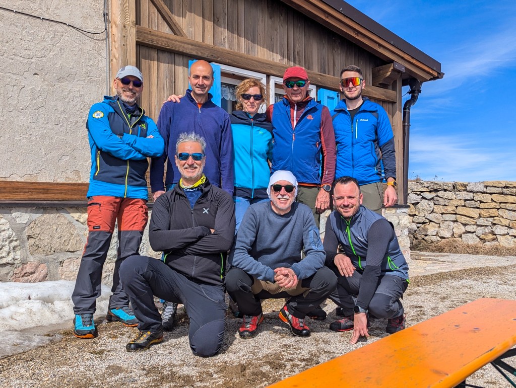 Lì dal rifugio, ancora circondato da un po’ di neve, lo sguardo ha poi spaziato su un panorama immenso: nonostante una leggera foschia all’orizzonte, abbiamo abbracciato in un unico colpo d’occhio il Garda, il Brenta, l’Adamello e il Catinaccio.